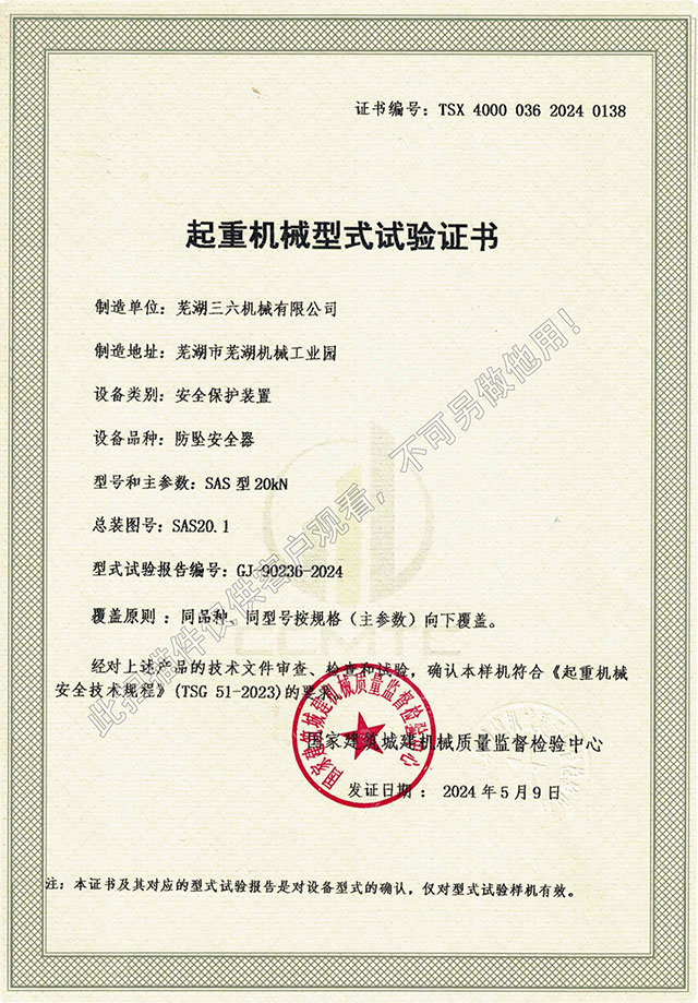 • SAS型20kN防墜器型式試驗(yàn)證書(shū)