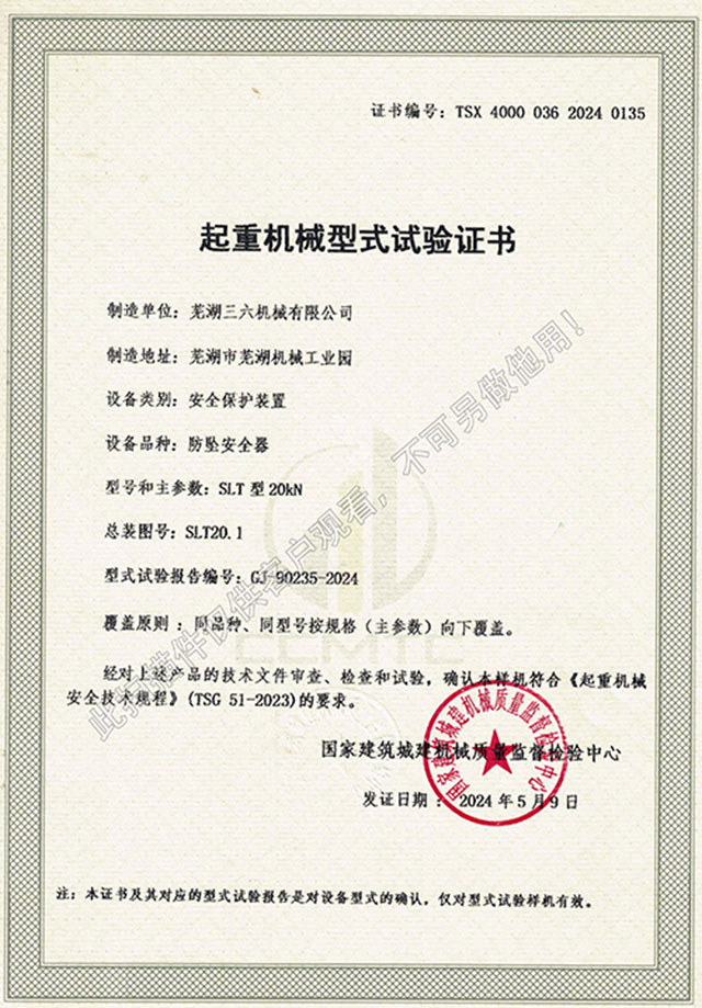 • SLT型20kN防墜器型式試驗(yàn)證書(shū)